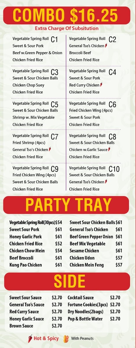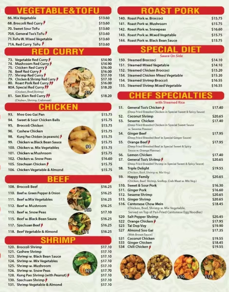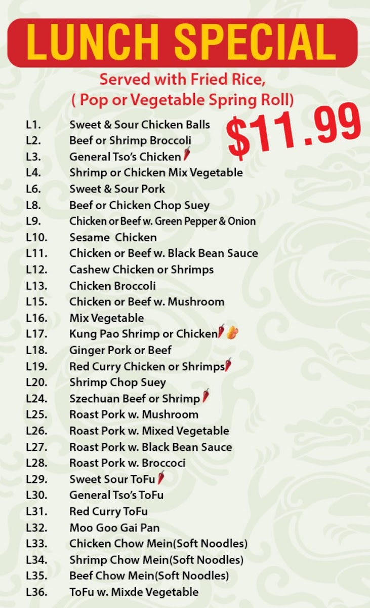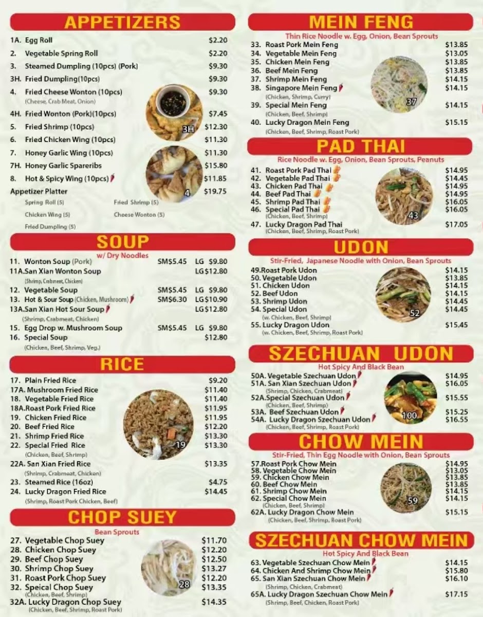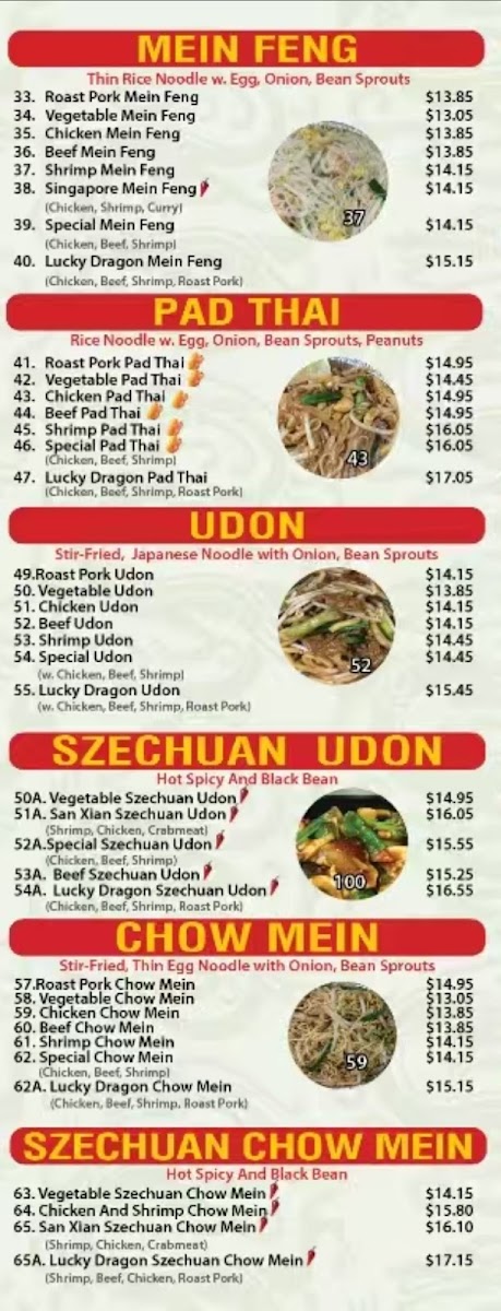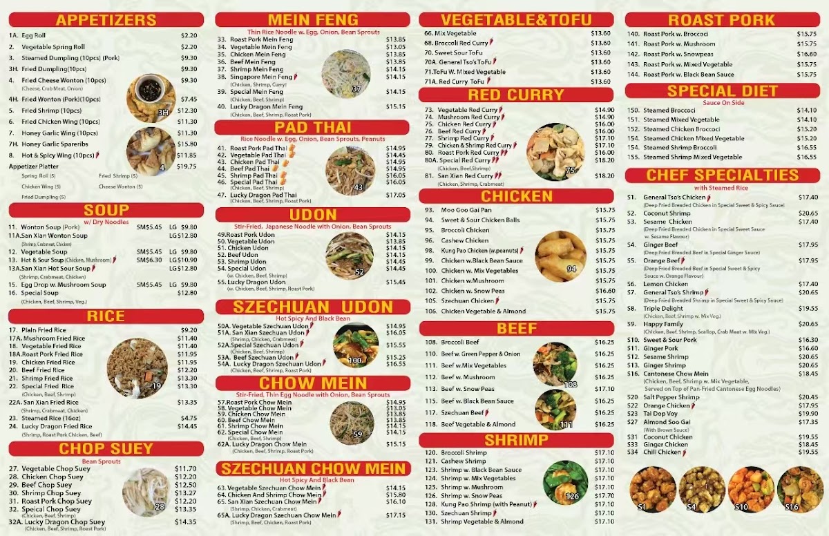 The menu at Lucky Dragon in Niagara Falls offers a welcoming selection of Asian fusion dishes crafted for takeout convenience. It's a straightforward, approachable menu where familiar favorites and chef specialties come together to satisfy a variety of cravings. From comfort classics like Chicken Fried Rice and Sweet and Sour Pork to more distinctive choices such as General Tso’s Chicken and Szechuan Udon, the offerings capture a blend of Chinese and Thai flavors suited for any time you want a satisfying meal at home.